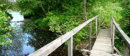 luontopolku, joka vie pieniä puusiltoja pitkin saaresta toiseen.